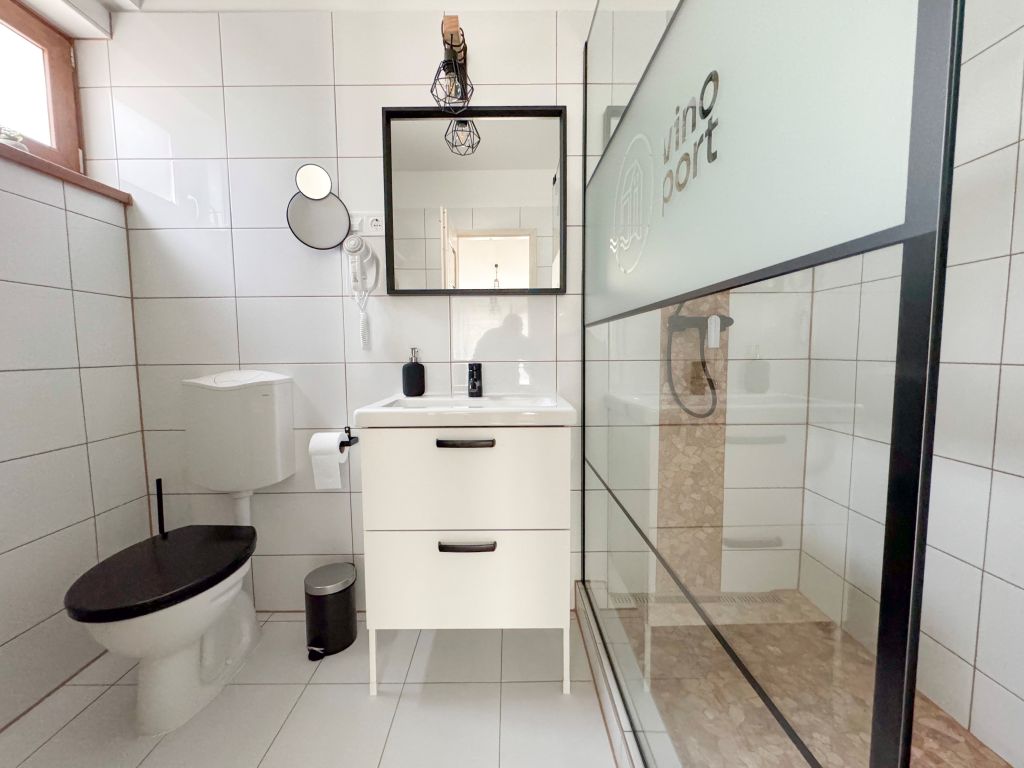 A külön nyíló fürdőszobában walk-in zuhanyzó, hajszárító, világító kozmetikai tükör került kialakításra. A szobában okostv található.