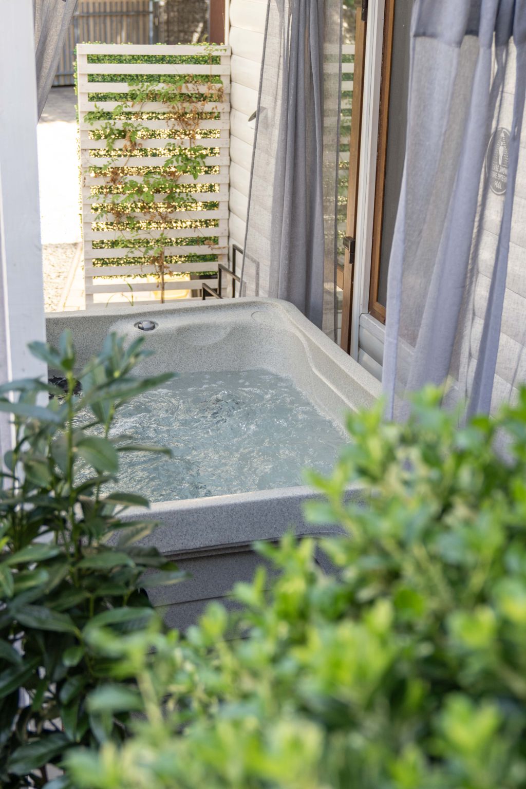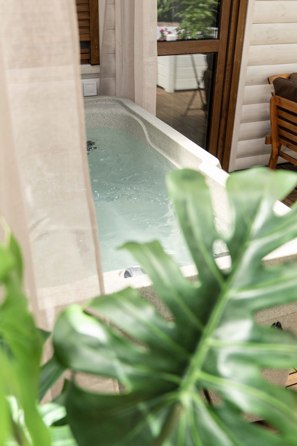 Saját 18m2 privát fedett terasszal rendelkezik, melyen egy kerti ülőgarnitúra valamint egy kétszemélyes privát jakuzzi helyezkedik el (külön díjazás fejében vehető igénybe).