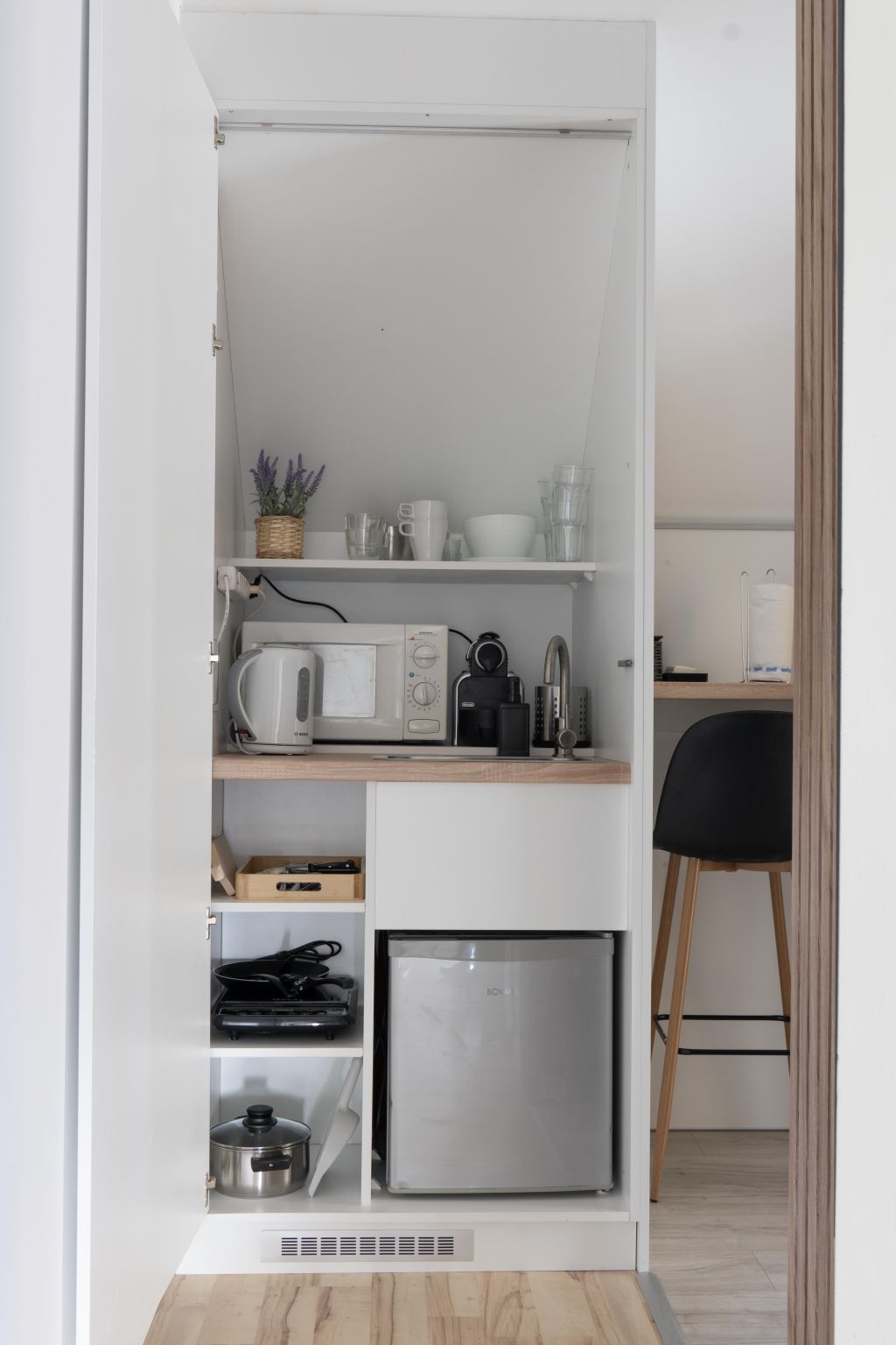 1., 2., 4. apartmanhoz két állásos főzőlap, mini hűtő, Nespresso kapszulás kávéfőző, vízforraló, mikrohullámú sütő, kenyérpirító, edények, tányérok, étkészlet.