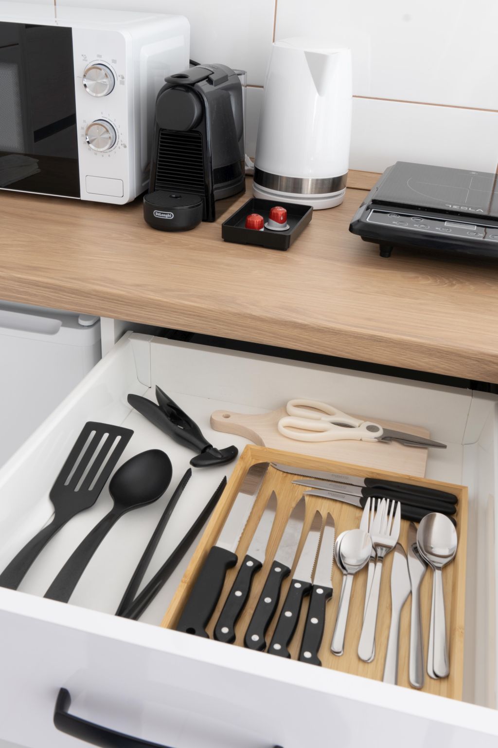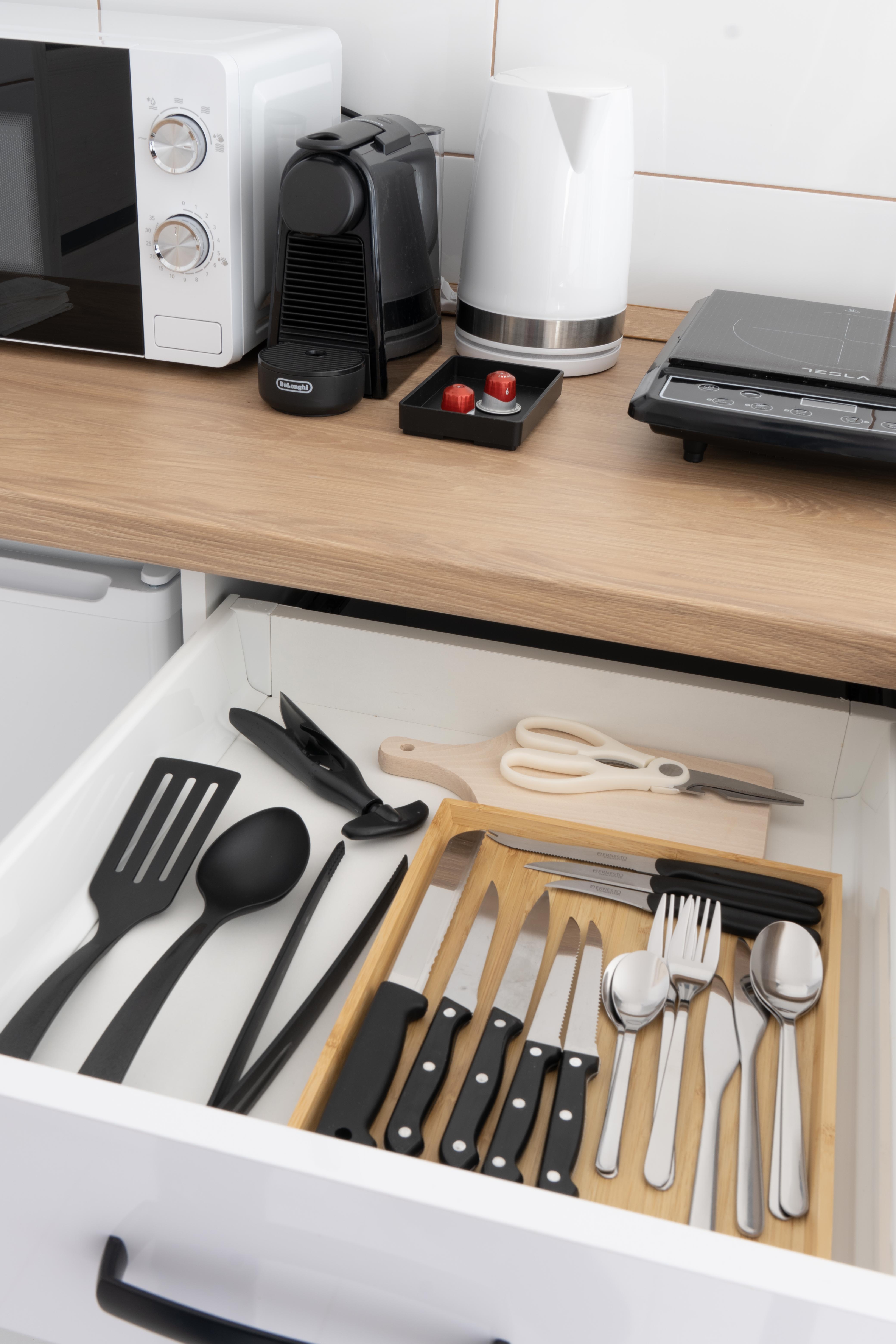 A 3. apartman teljes értékű konyhával berendezett; nagy hűtő fagyasztóval, mikro hullámos sütő, négy állásos kerámia főzőlap, elektromos sütő, Nespresso kávéfőző, vízforraló edények tányérok étkészlet négy fő részére.
