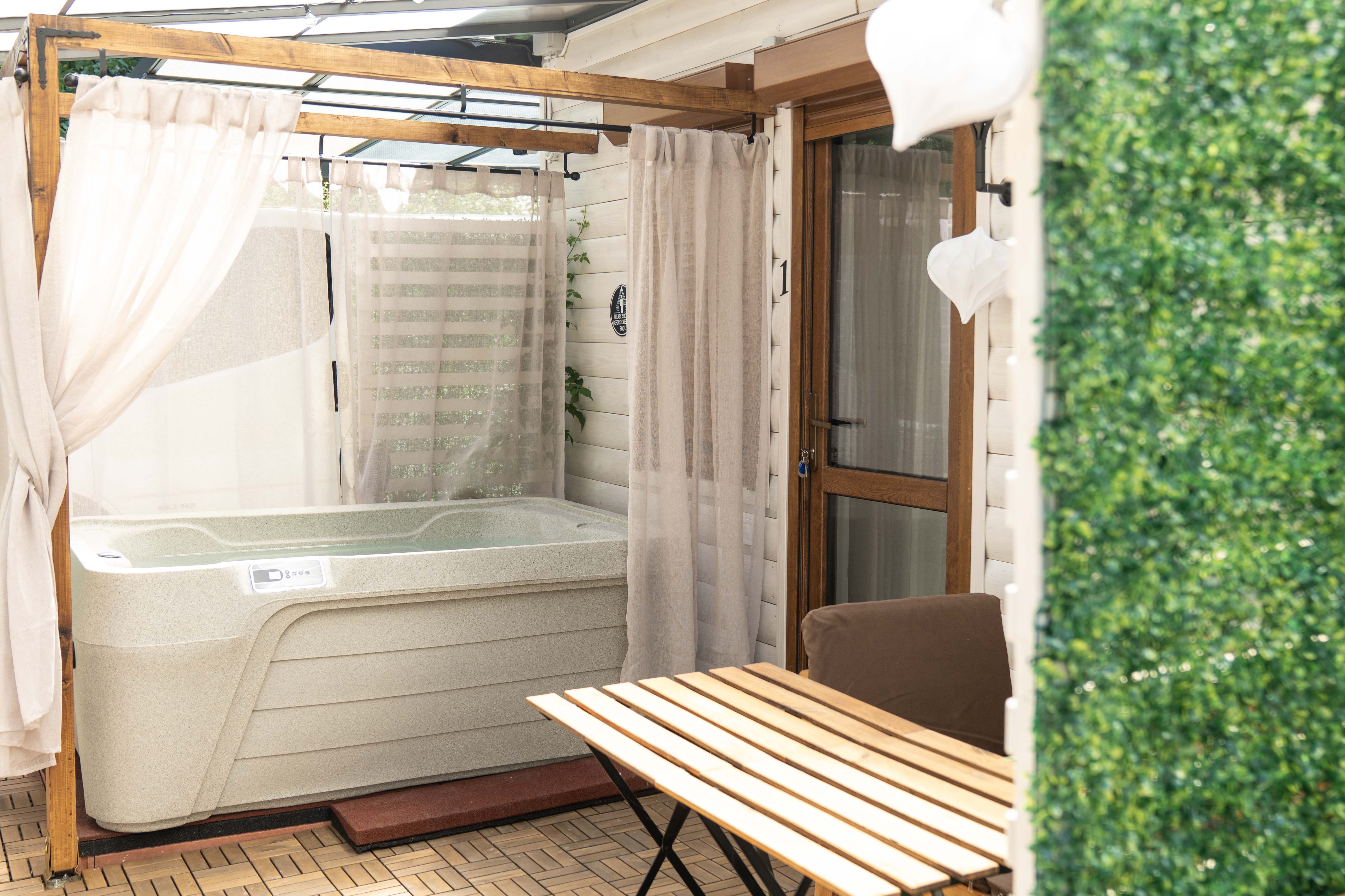 Saját 15m2 privát fedett terasszal rendelkezik, melyen egy kerti ülőgarnitúra valamint egy kétszemélyes privát jakuzzi helyezkedik el (külön díjazás fejében vehető igénybe).